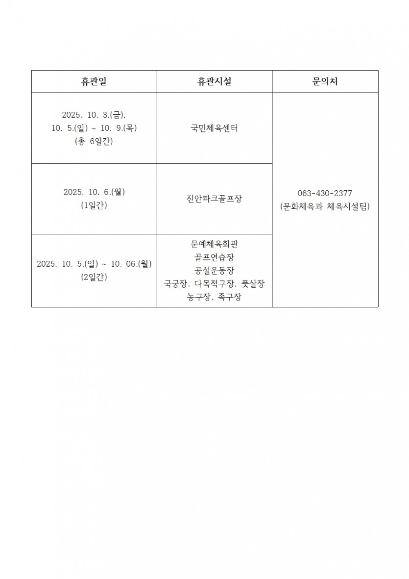 추석 연휴 진안군 공공체육시설 휴관 알림 페이지 정보 작성자 관리자 댓글 0건 조회 78회 작성일 25-09-25 09:30 목록 본문 다음글전민일보배 파크골프 대회 대진표 25.09.09